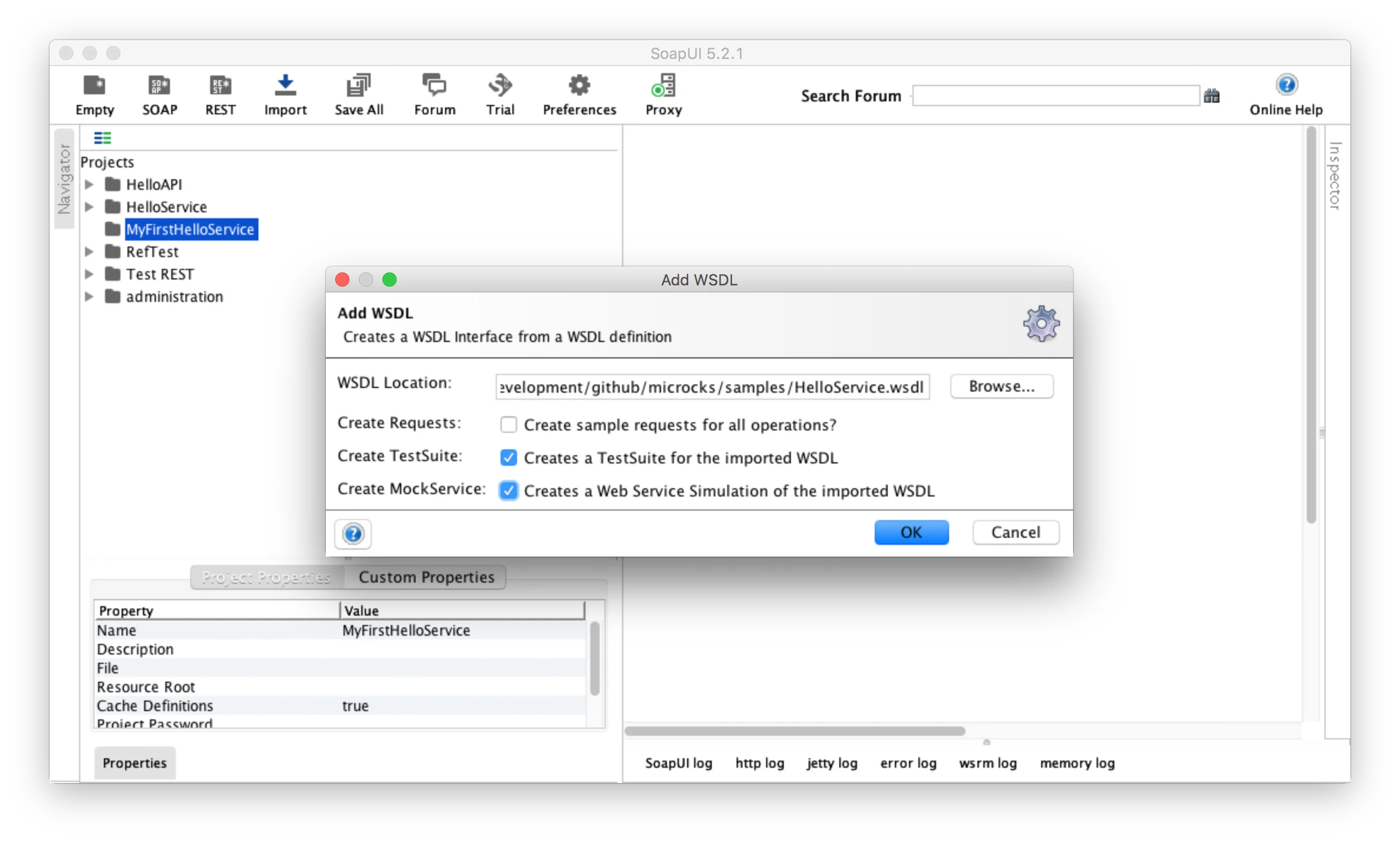 Project initialization is as simple as creating a new Empty Project in SoapUI. The Tests Request you will need to define later will be defined through a SoapUI TestSuite ; the Mock Responses you will need to define later will be defined through a SoapUI ServiceMock. It is a better choice to directly create those items through the wizard when choosing the Add WSDL or Add WADL actions once project has been created.