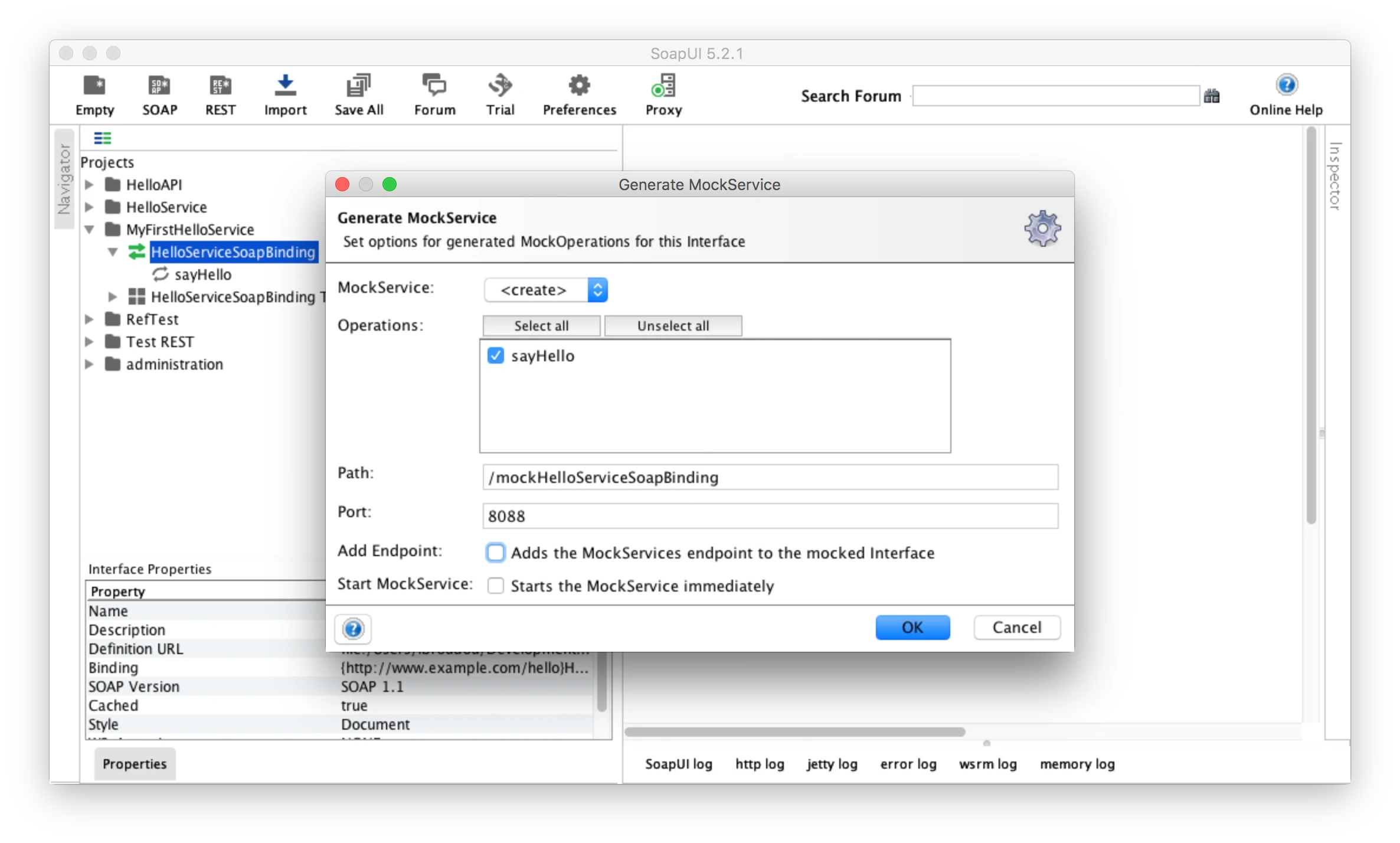 Mock Responses you will need to define later will be defined through a SoapUI ServiceMock. You have to select the newly imported Service, right-click and choose Generate MockService. You can let the default options as shown below and give your MockService a name like "<Service> Mock":