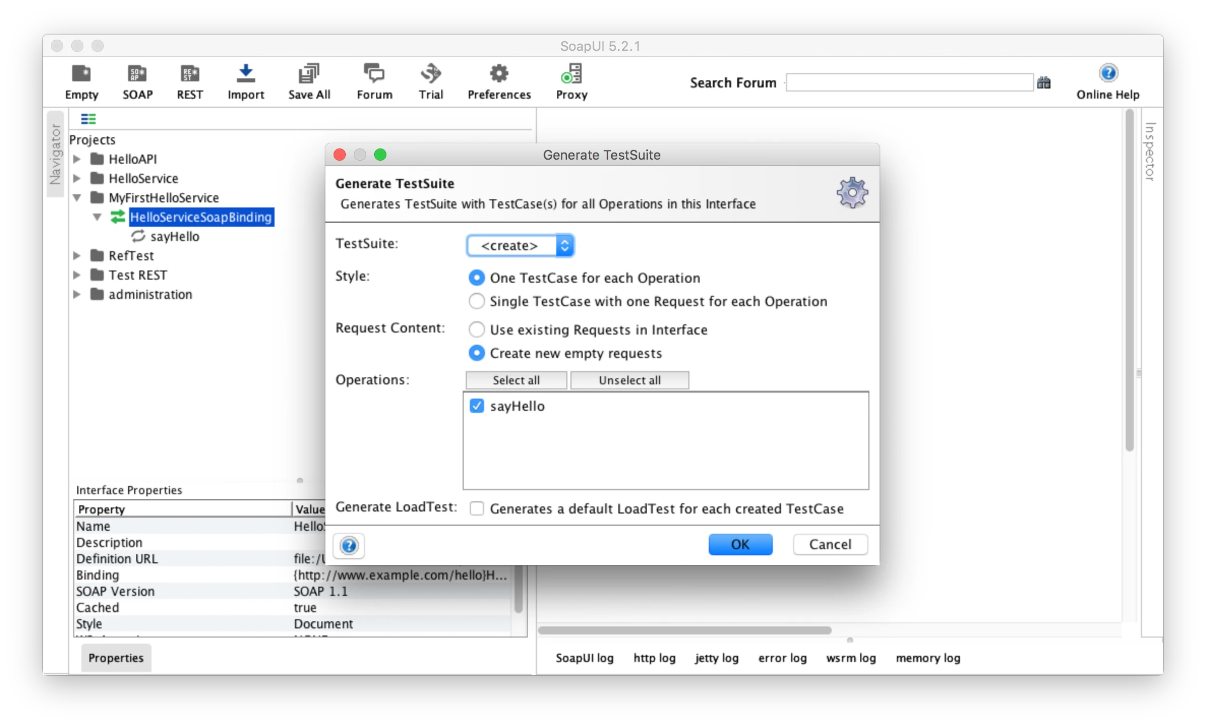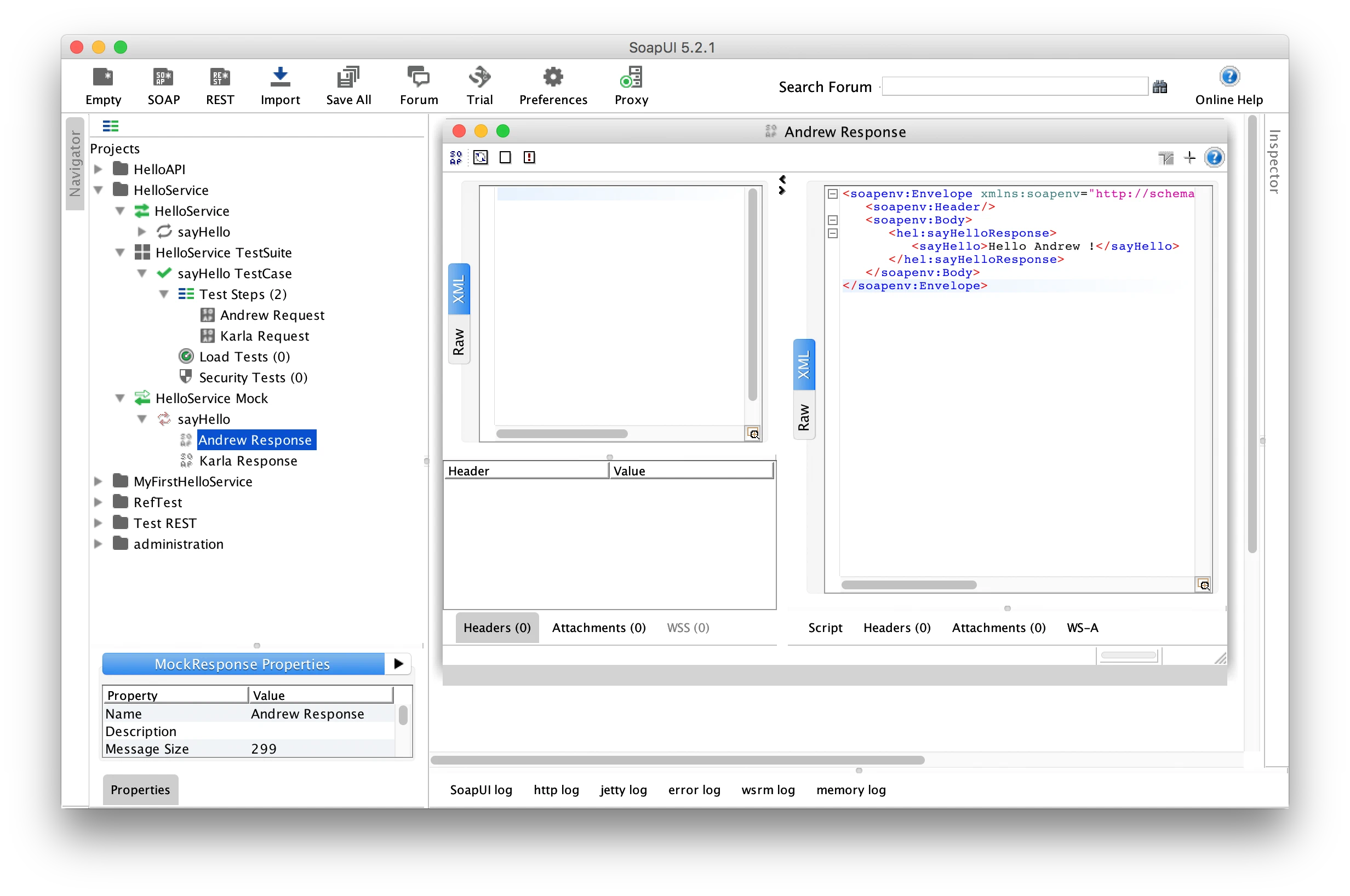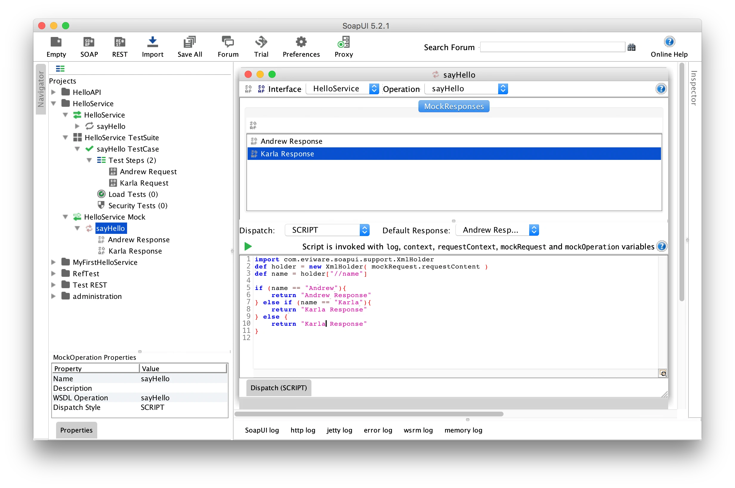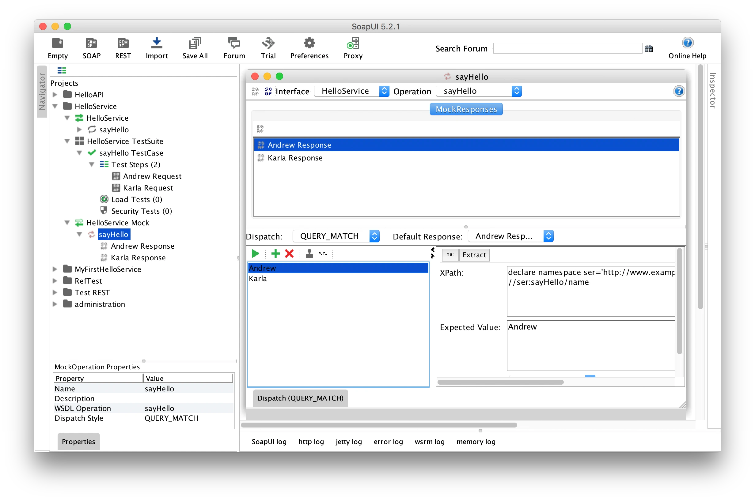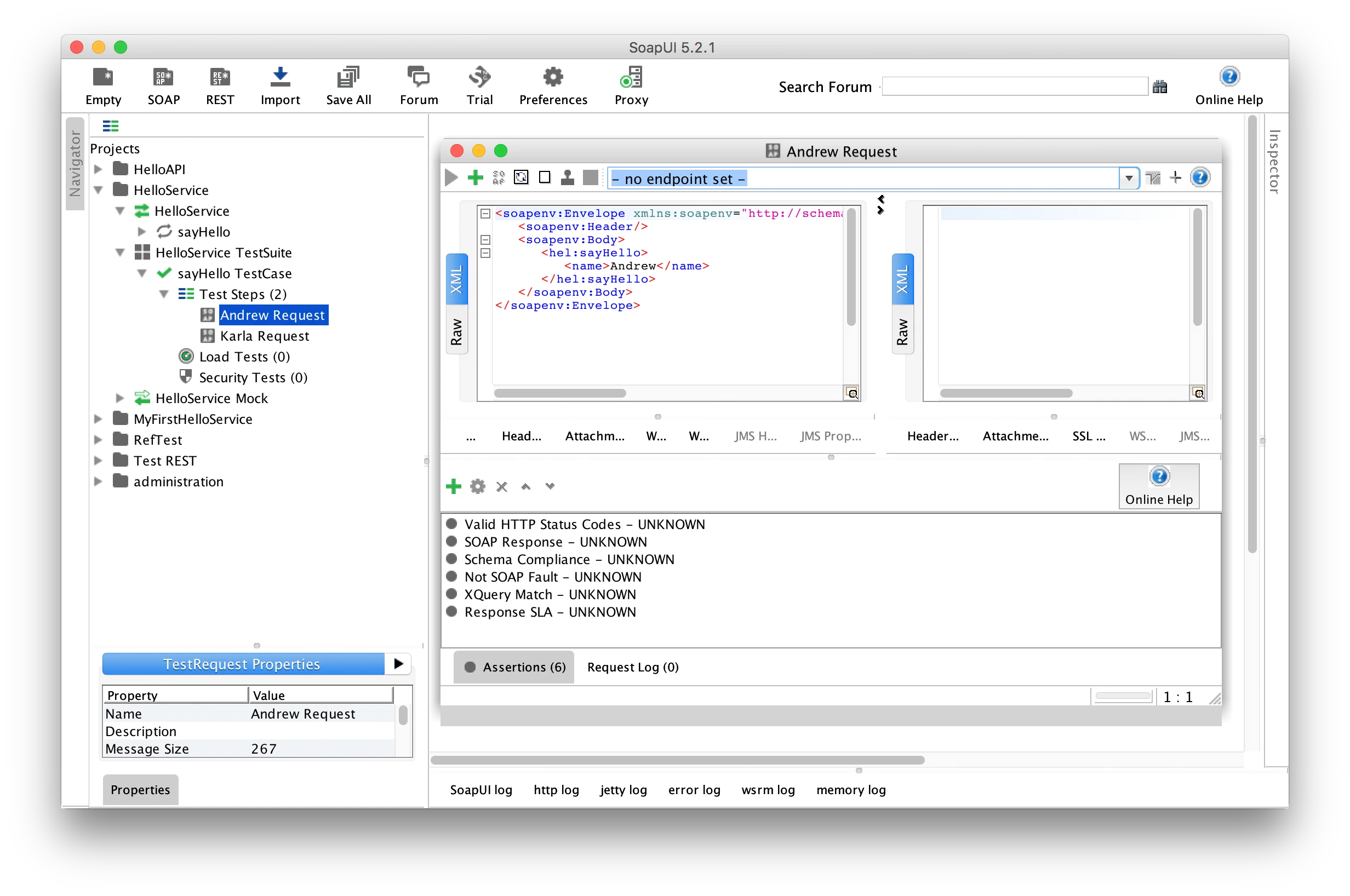 You are now free to create as many TestSteps as you want within the TestCases. TestCases represents the Operation level and TestSteps represents the request sample level. The screenshot below shows how we have created 2 sample requests (Andrew and Karla) for the sayHello operation of our WebService: